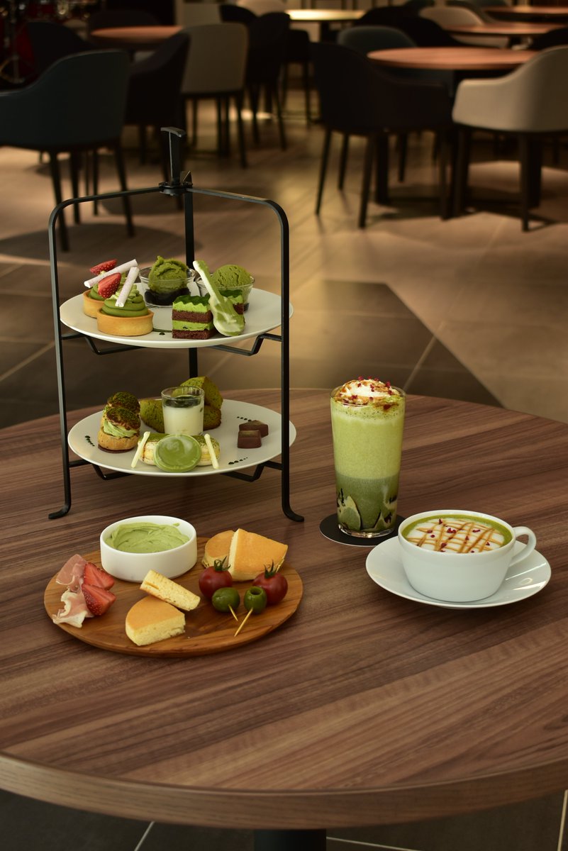 ケーキやスコーンなどのスイーツに黒糖抹茶ラテが付いた、抹茶を堪能できる限定プランが登場!プレートには抹茶カラーの楽器も隠れていますよ♪